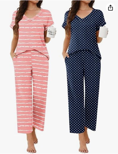 Ekouaer 2 Pack Pajamas for Women Short Sleeve V Neck Pj 2 Piece Lounge Sets S-XXL
