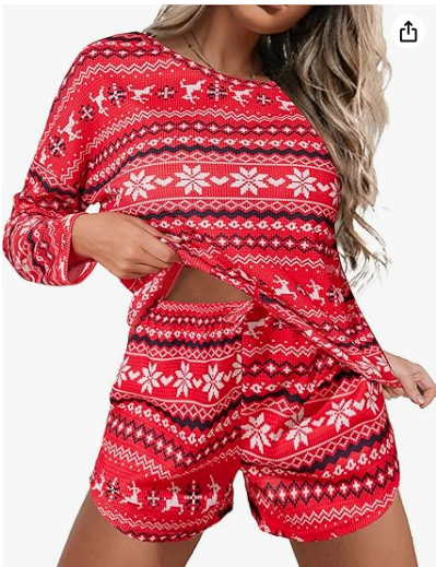 Ekouaer Womens Waffle Knit Pajama Sets Long Sleeve Top and Shorts Matching Lounge Set Loungewear Sweatsuit with Pockets