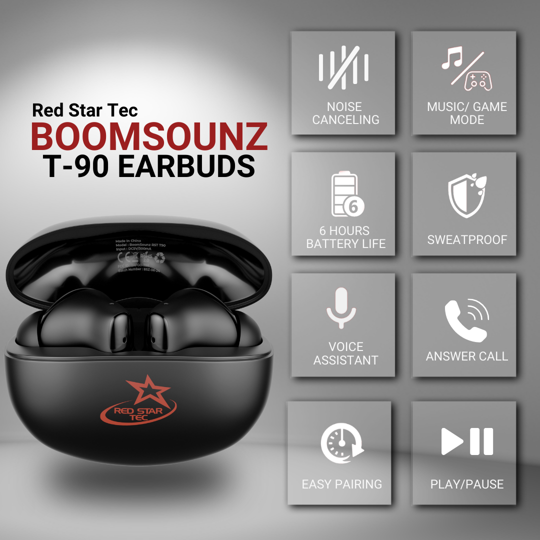T-90 BoomSounZ Sweatproof Wireless Earbuds – ENC Noise Cancelling Ear buds with Dual Mode for Music & Gaming, Deep Bass Touch Controls, Fast Charging Long Battery Life, Secure Fit for Workouts & Calls