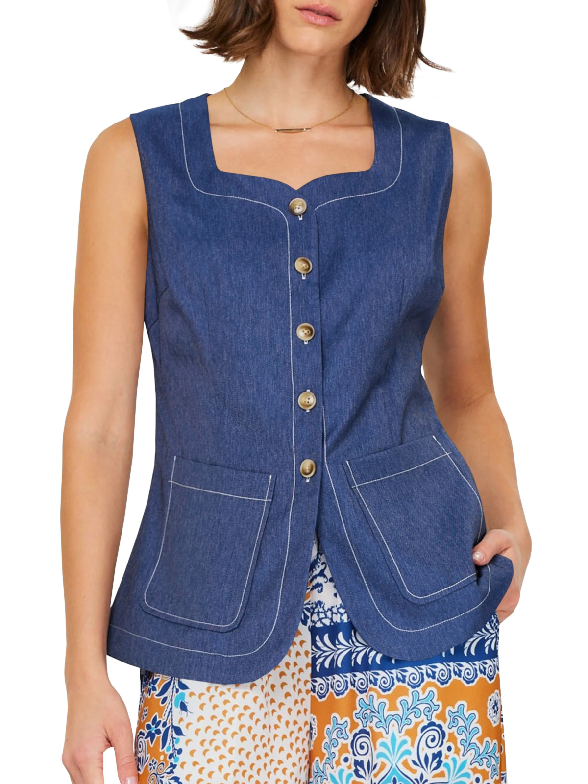 Tankaneo Womens Square Neck Denim Vest Button Down Sleeveless Jean Waistcoat Summer Casual Jean Tops with Pockets